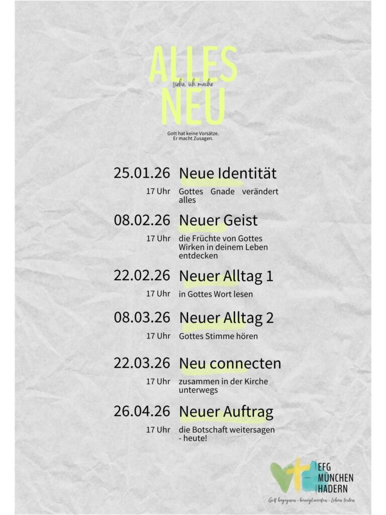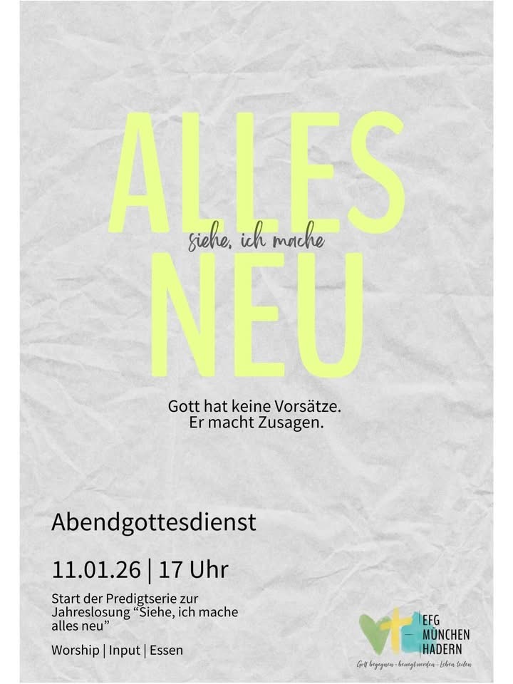 Mehr Gym, mehr Me-Time, weniger Handy. Ein neues Jahr ist eine gute Möglichkeit, einen Neustart zu wagen. Aber gar nicht so leicht, dabei zu bleiben. Bei Gott ist das anders. Er macht keine Vorsätze, sondern Zusagen. Er schafft neues Leben, eine neue Realität! Das alte ist vergangen. Wie sich das konkret jetzt schon in deinem Leben zeigt und was da alles dazu gehört, darum geht es in unserer Predigtserie im Abendgottesdienst. Start ist am 11.01.26 um 17 Uhr Danach gibt es wie immer gemeinsames Essen und Zeit für Hangout. Sei dabei!